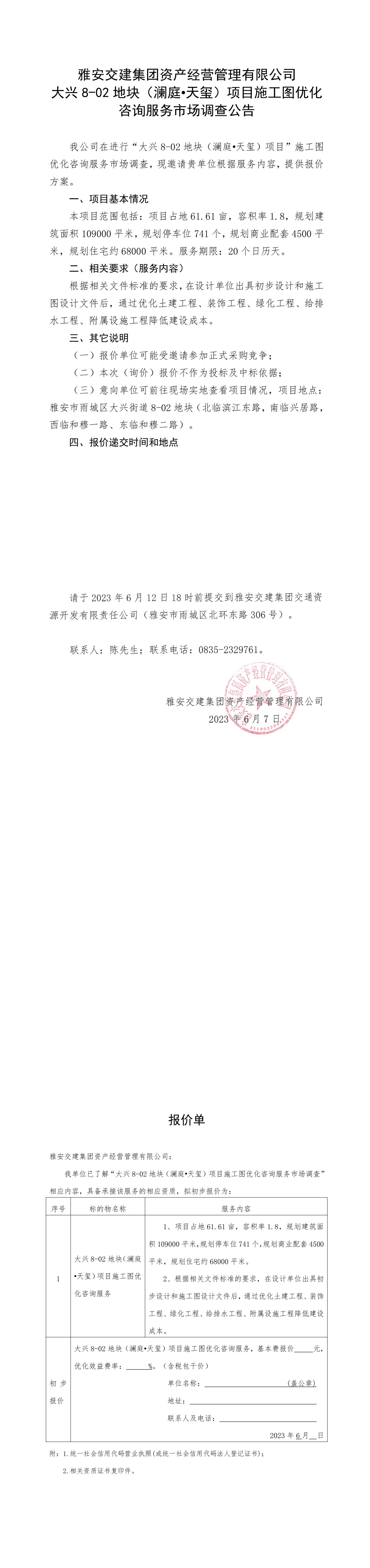 雅安交建集團資產(chǎn)經(jīng)營管理有限公司大興8-02地塊(瀾庭·天璽)項目施工圖優(yōu)化咨詢服務市場調(diào)查公告