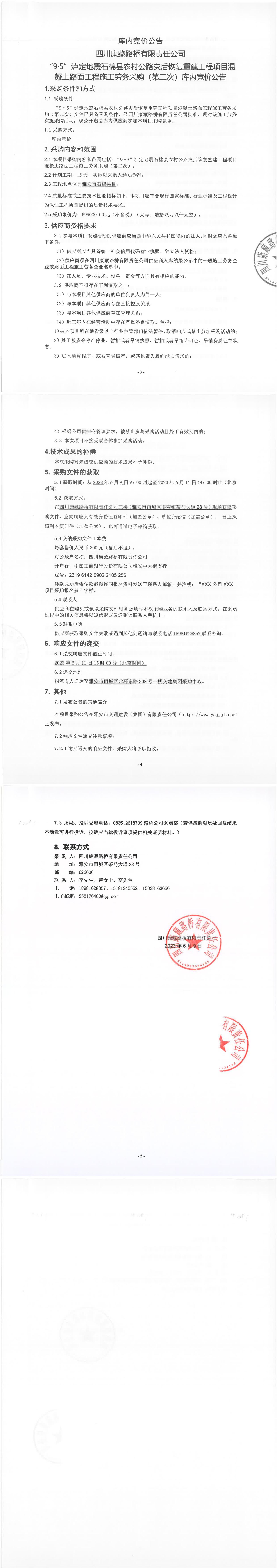 四川康藏路橋有限責(zé)任公司“9·5”瀘定地震石棉縣農(nóng)村公路災(zāi)后恢復(fù)重建工程項目混凝土路面工程施工勞務(wù)采購(第二次)庫內(nèi)競價公告