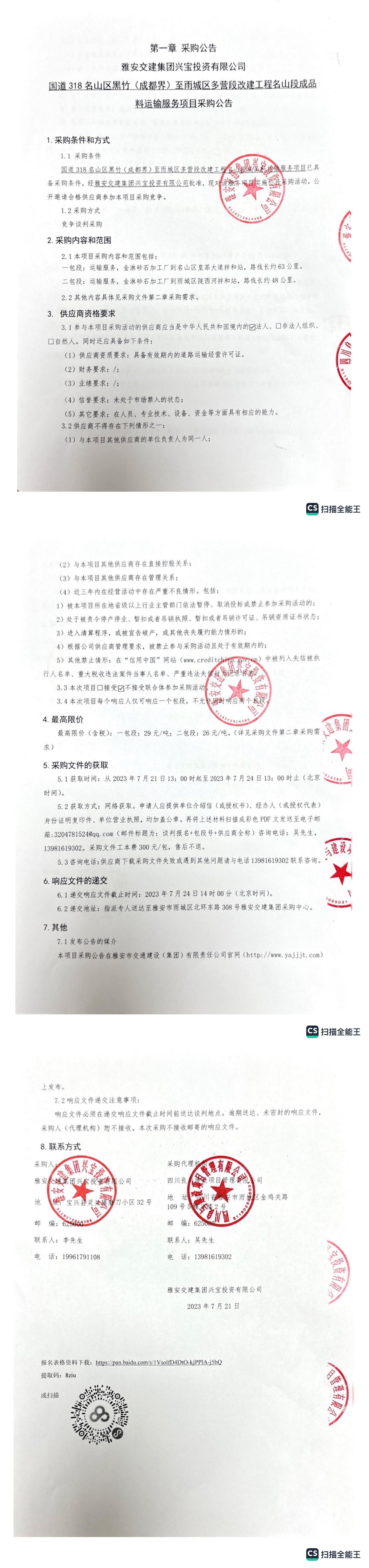 雅安交建集團(tuán)興寶投資有限公司國道318名山區(qū)黑竹(成都界)至雨城區(qū)多營段改建工程名山段成品料運(yùn)輸服務(wù)項目采購公告