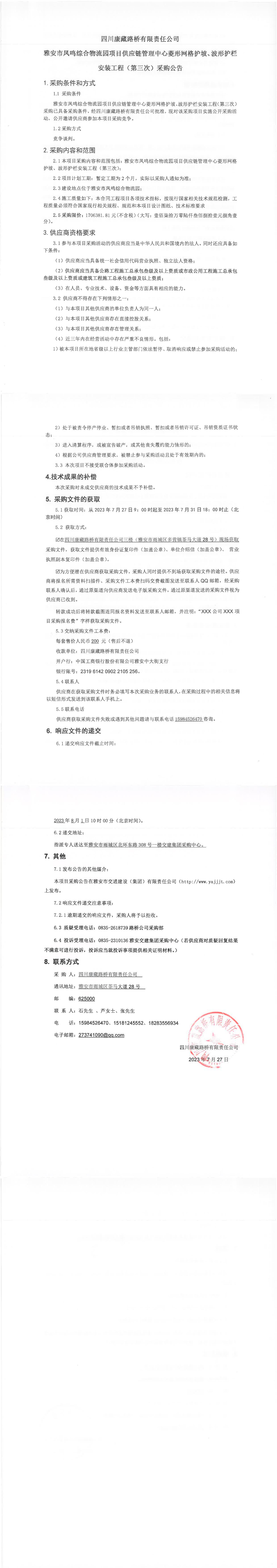 四川康藏路橋有限責(zé)任公司雅安市鳳鳴綜合物流園項目供應(yīng)鏈管理中心菱形網(wǎng)格護坡、波形護欄安裝工程(第三次)采購公告