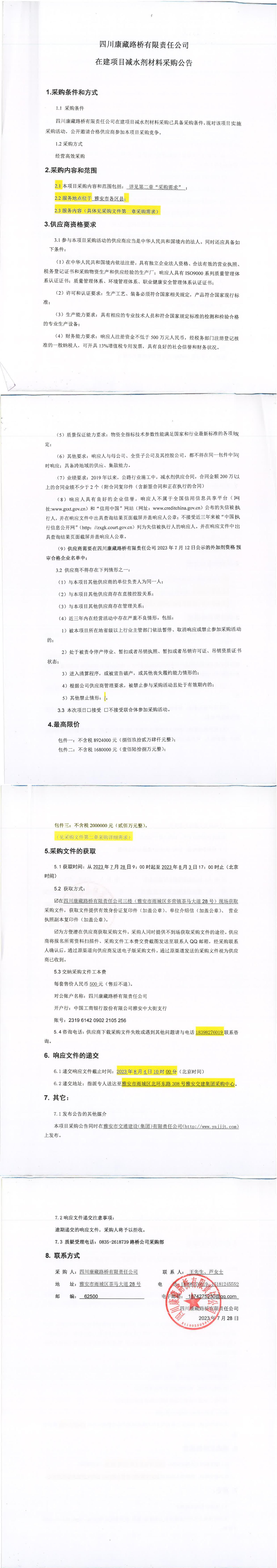 四川康藏路橋有限責(zé)任公司在建項(xiàng)目減水劑材料采購公告