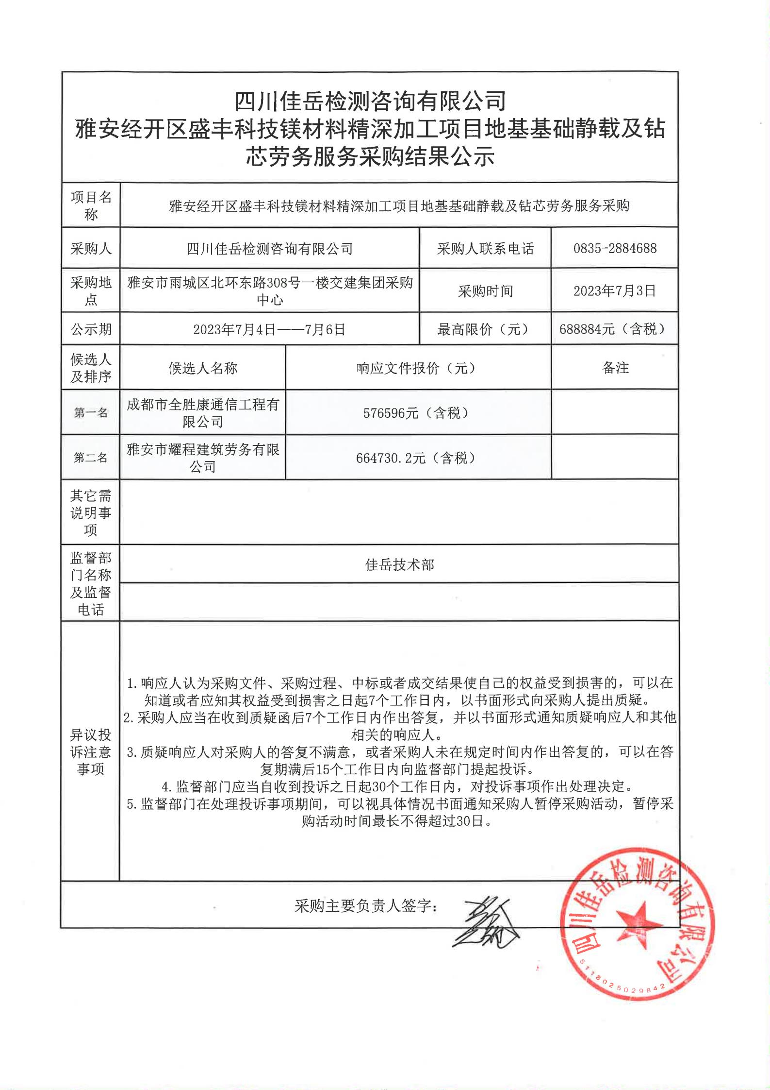 四川佳岳檢測(cè)咨詢有限公司雅安經(jīng)開(kāi)區(qū)盛豐科技鎂材料精深加工項(xiàng)目地基基礎(chǔ)靜載及鉆芯服務(wù)采購(gòu)結(jié)果公示