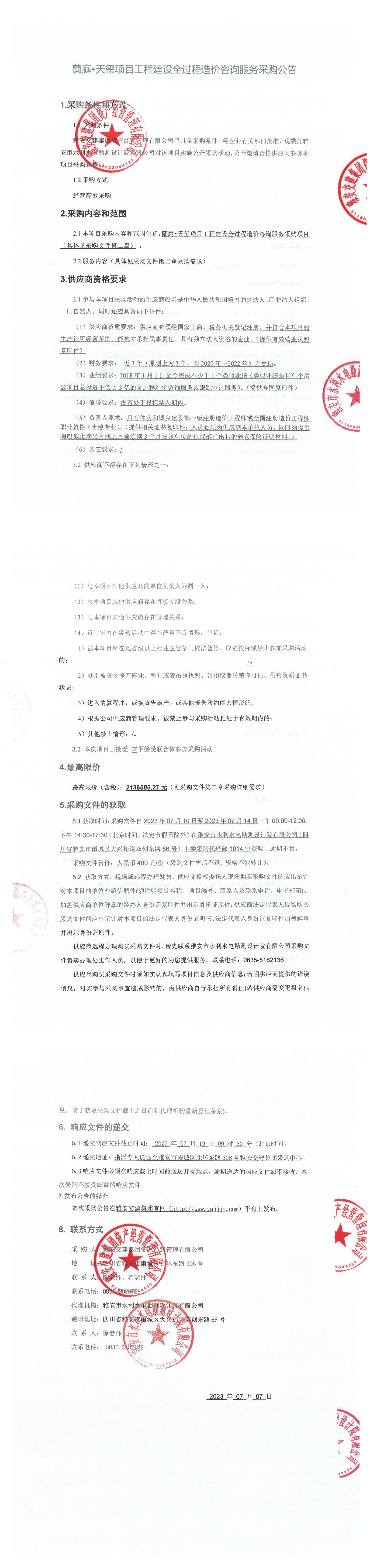 雅安交建集團資產(chǎn)經(jīng)營管理有限公司蘭庭•天璽項目工程建設(shè)全過程造價咨詢服務(wù)采購公告