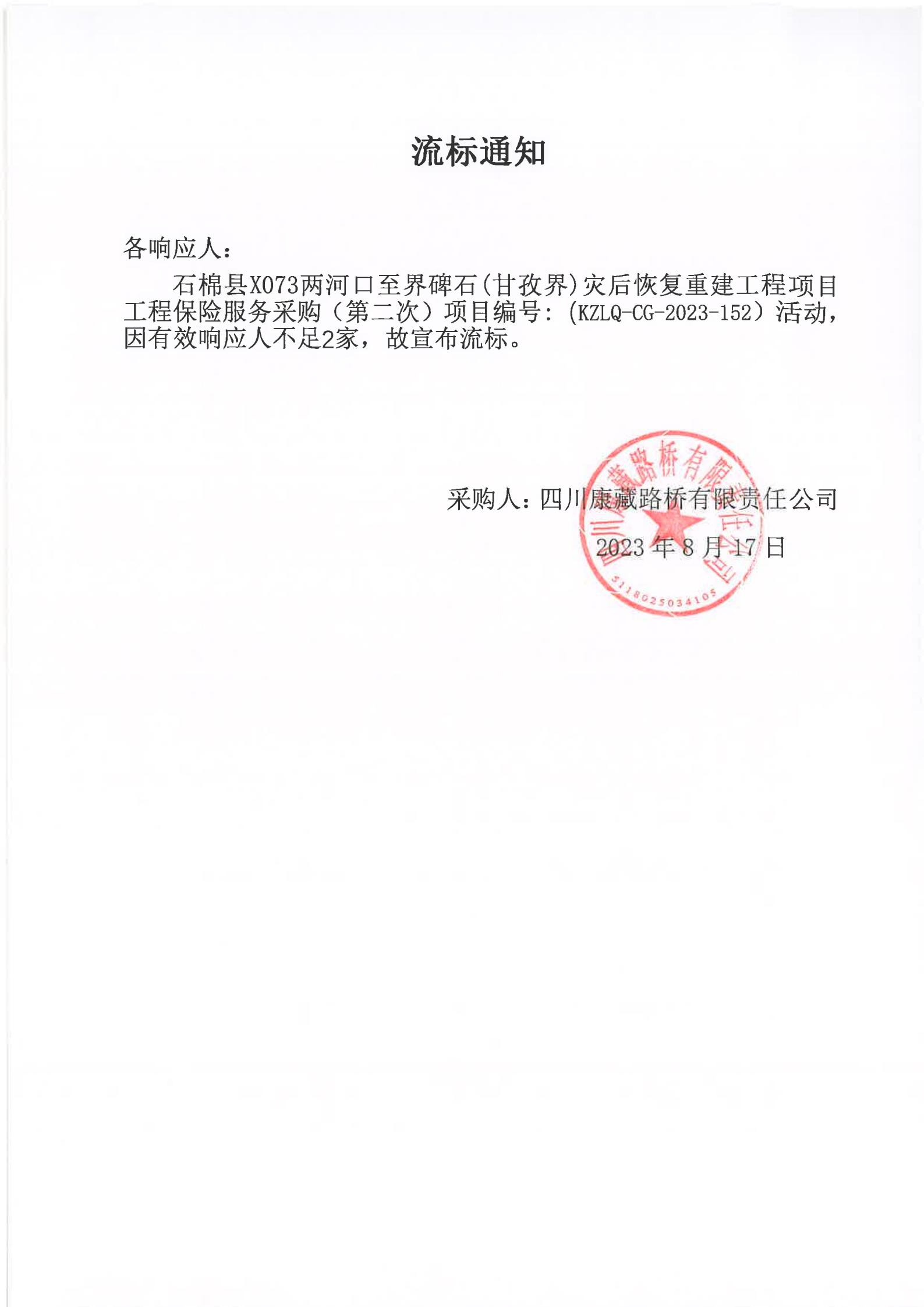 四川康藏路橋有限責(zé)任公司石棉縣X073兩河口至界碑石(甘孜界)災(zāi)后恢復(fù)重建工程項目工程保險服務(wù)采購(第二次)流標(biāo)通知