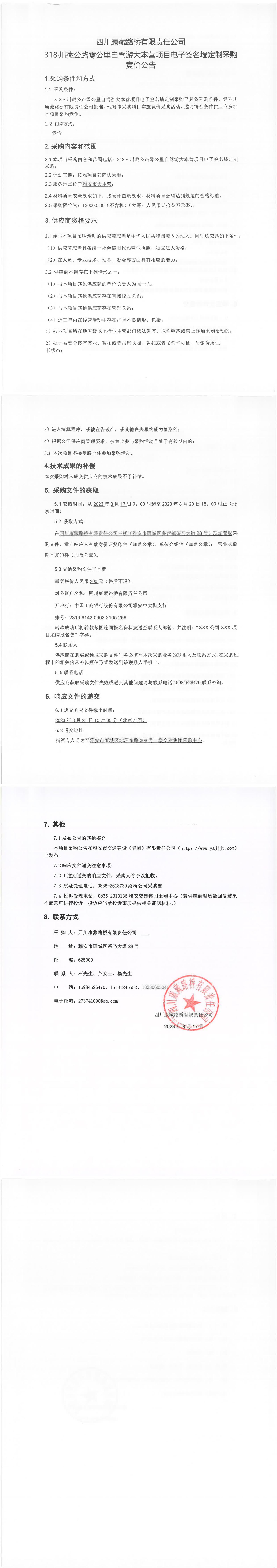 四川康藏路橋有限責(zé)任公司318·川藏公路零公里自駕游大本營項目電子簽名墻定制采購競價公告