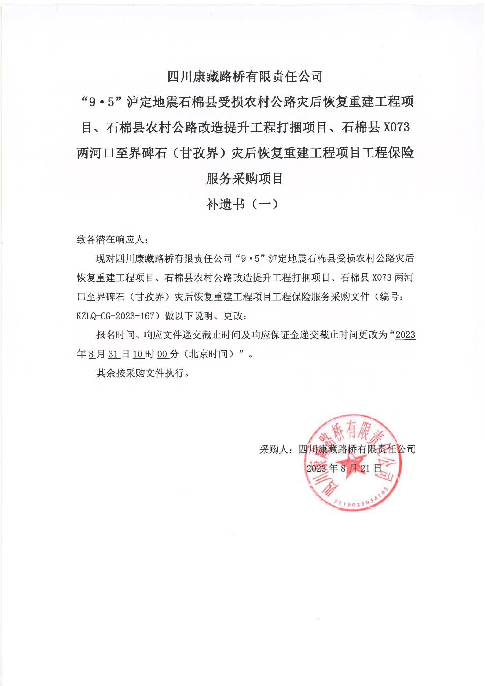 四川康藏路橋有限責(zé)任公司“9·5”瀘定地震石棉縣受損農(nóng)村公路災(zāi)后恢復(fù)重建工程項(xiàng)目、石棉縣農(nóng)村公路改造提升工程打捆項(xiàng)目、石棉縣X073兩河口至界碑石(甘孜界)災(zāi)后恢復(fù)重建工程項(xiàng)目工程保險(xiǎn)服務(wù)采購(gòu)項(xiàng)目補(bǔ)遺書(shū)(一)