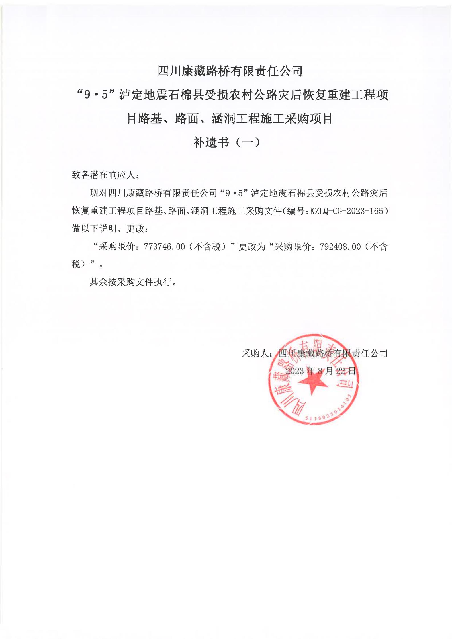 四川康藏路橋有限責任公司“9·5”瀘定地震石棉縣受損農(nóng)村公路災后恢復重建工程項目路基、路面、涵洞工程施工采購項目補遺書(一)