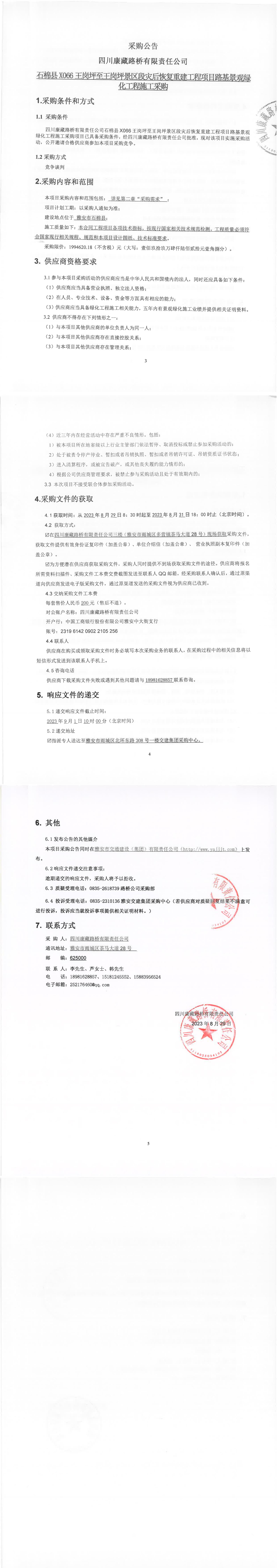 四川康藏路橋有限責(zé)任公司石棉縣X066王崗坪至王崗坪景區(qū)段災(zāi)后恢復(fù)重建工程項(xiàng)目路基景觀綠化工程施工采購公告