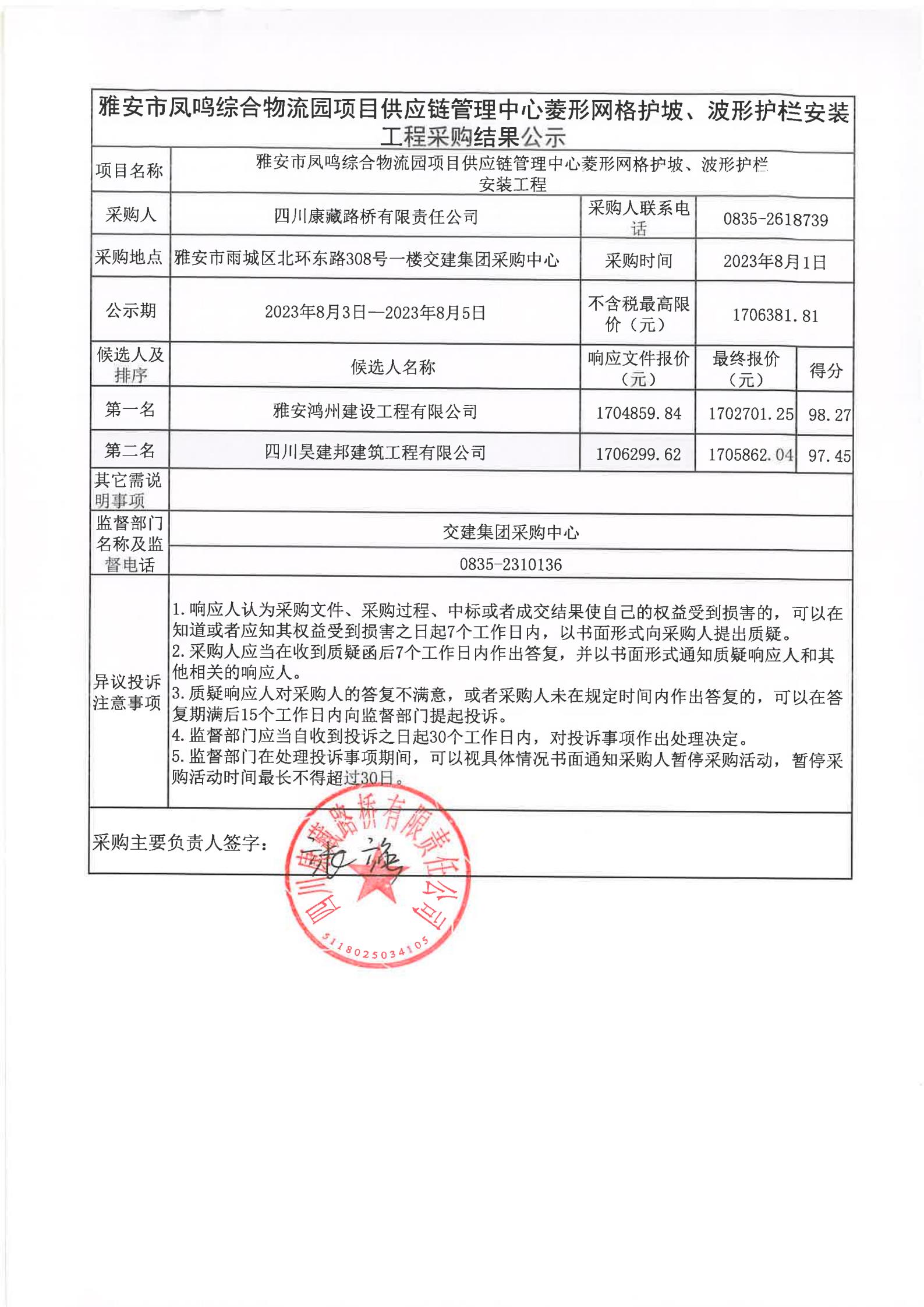 四川康藏路橋有限責(zé)任公司雅安市鳳鳴綜合物流園項(xiàng)目供應(yīng)鏈管理中心菱形網(wǎng)格護(hù)坡、波形護(hù)欄安裝工程采購(gòu)結(jié)果公示