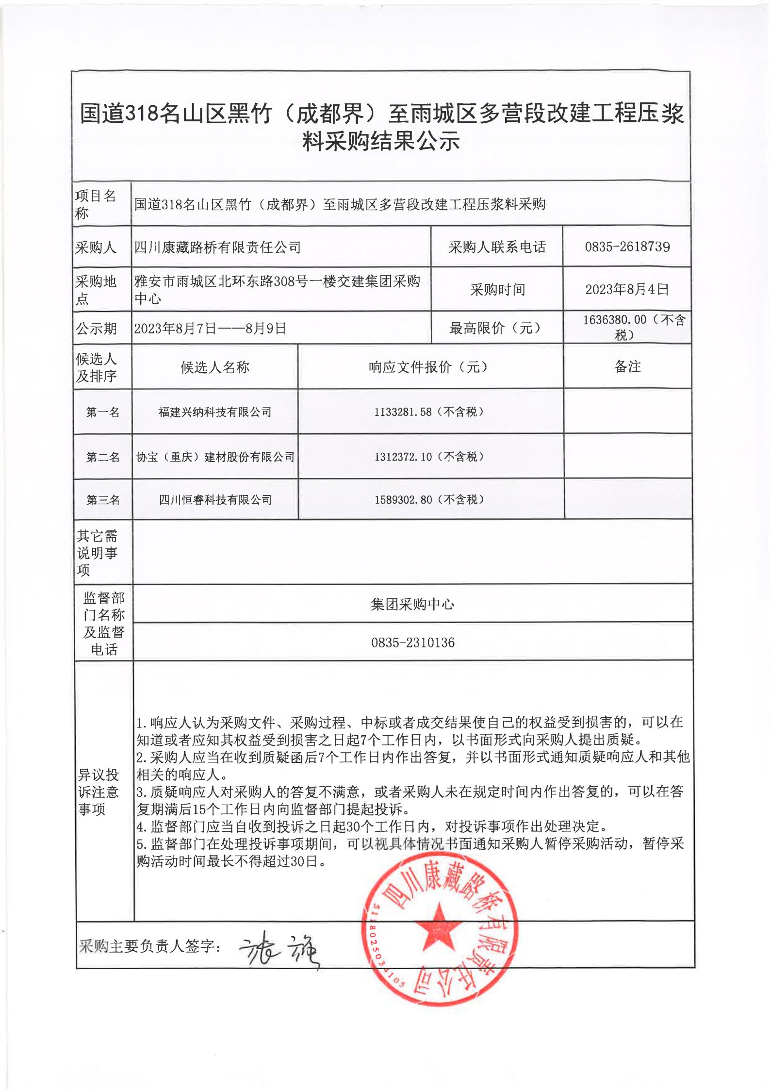 四川康藏路橋有限責任公司國道318名山區(qū)黑竹(成都界)至雨城區(qū)多營段改建工程壓漿料采購結果公示