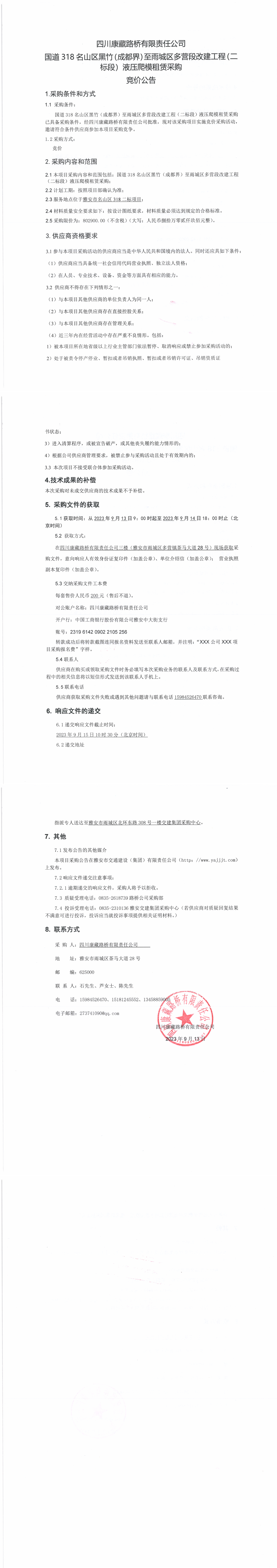 四川康藏路橋有限責任公司國道318名山區(qū)黑竹(成都界)至雨城區(qū)多營段改建工程(二標段)液壓爬模租賃采購競價公告