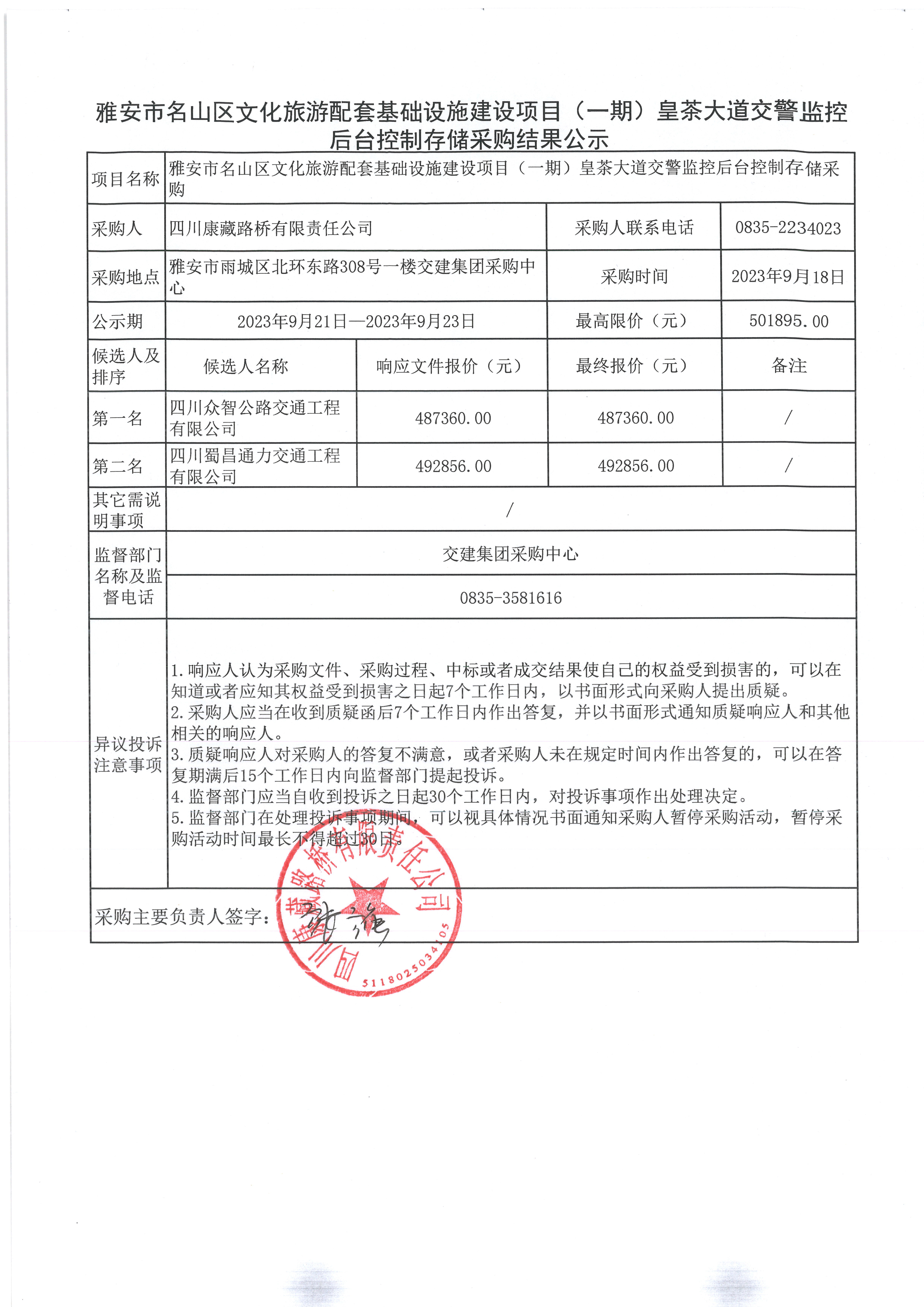 四川康藏路橋有限責任公司雅安市名山區(qū)文化旅游配套基礎設施建設項目(一期)皇茶大道交警監(jiān)控后臺控制存儲采購結(jié)果公示