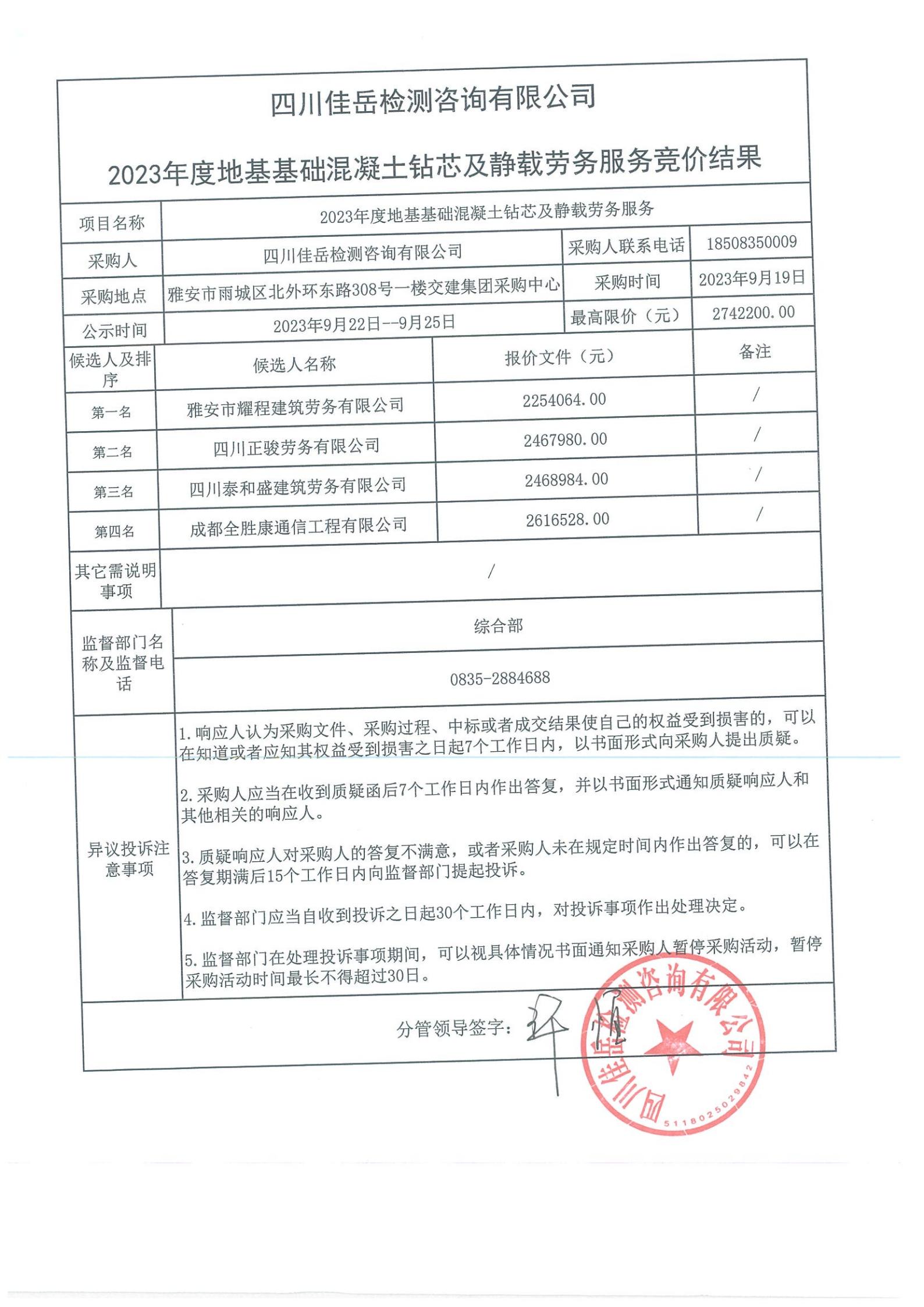 四川佳岳檢測咨詢有限公司2023年度地基基礎混凝土鉆芯及靜載勞務庫內(nèi)競價結(jié)果
