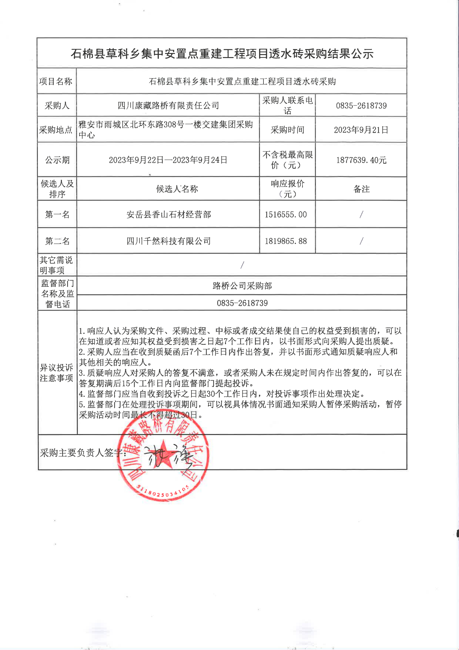 四川康藏路橋有限責任公司石棉縣草科鄉(xiāng)集中安置點重建工程項目透水磚采購結(jié)果公示