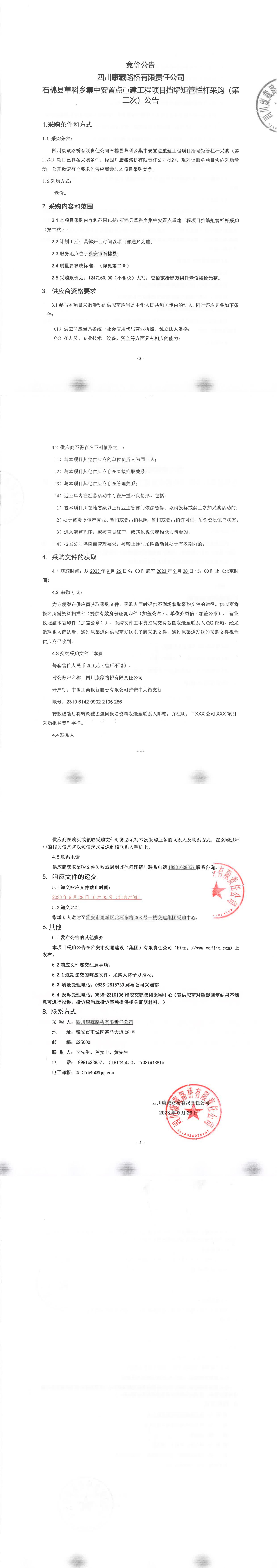 四川康藏路橋有限責(zé)任公司石棉縣草科鄉(xiāng)集中安置點(diǎn)重建工程項(xiàng)目擋墻矩管欄桿采購(第二次)公告