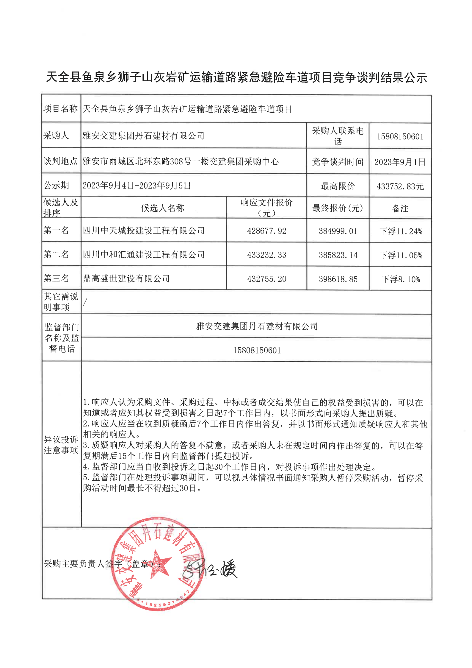 雅安交建集團丹石建材有限公司天全縣魚泉鄉(xiāng)獅子山灰?guī)r礦運輸?shù)缆肪o急避險車道項目競爭談判結(jié)果公示