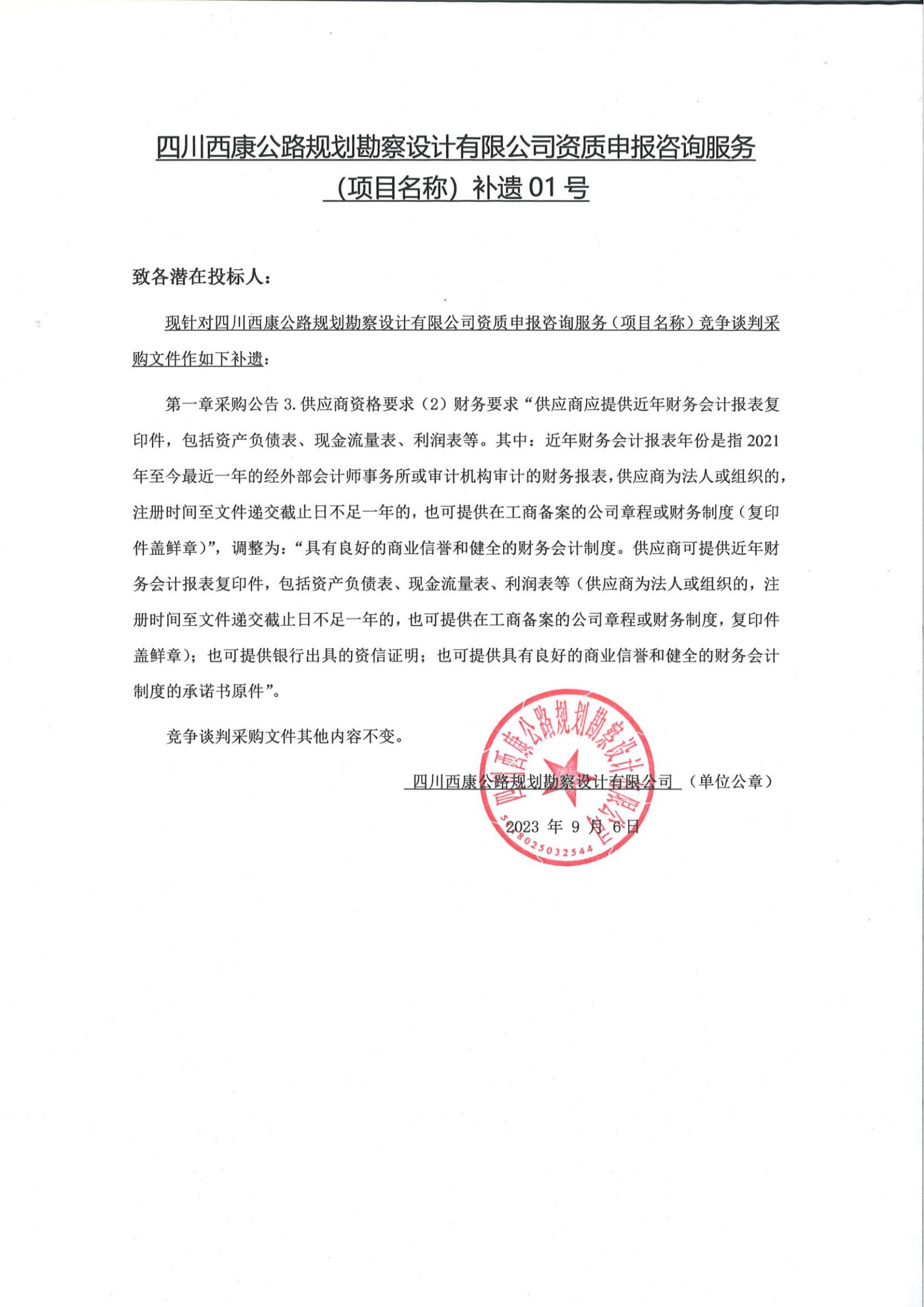 四川西康公路規(guī)劃勘察設計有限公司資質(zhì)申報咨詢服務(項目名稱)補遺01號