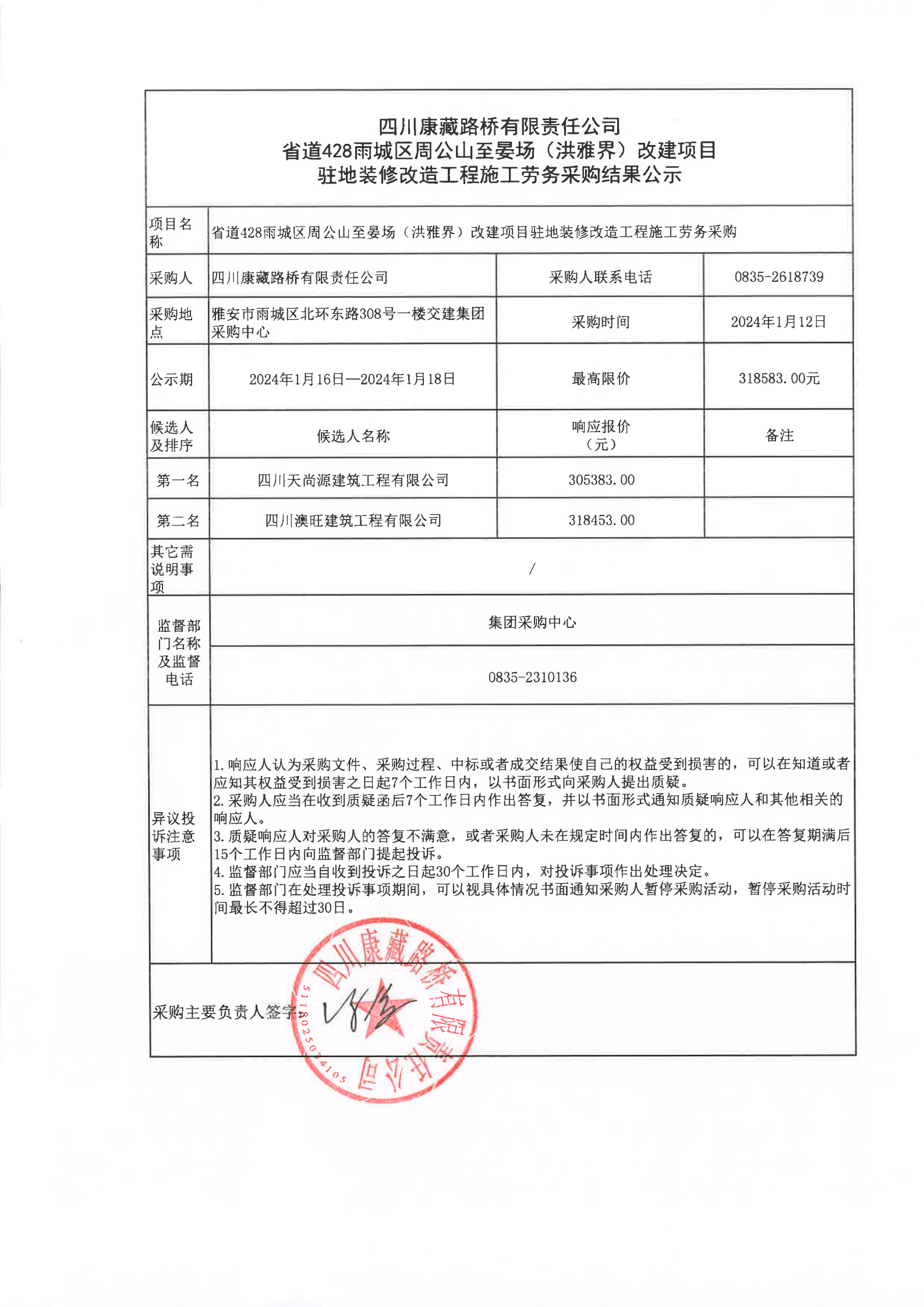 四川康藏路橋有限責任公司省道428雨城區(qū)周公山至晏場(洪雅界)改建項目駐地裝修改造工程施工勞務(wù)采購結(jié)果公示
