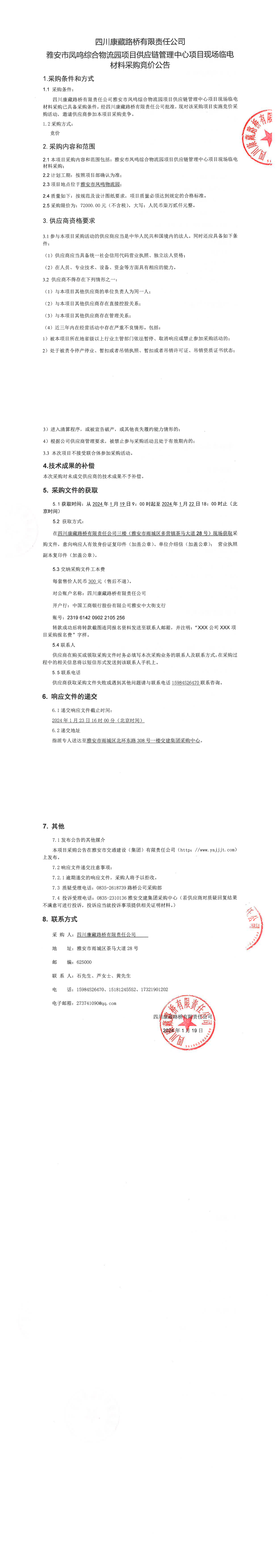 四川康藏路橋有限責(zé)任公司雅安市鳳鳴綜合物流園項(xiàng)目供應(yīng)鏈管理中心項(xiàng)目現(xiàn)場(chǎng)臨電材料采購(gòu)競(jìng)價(jià)公告