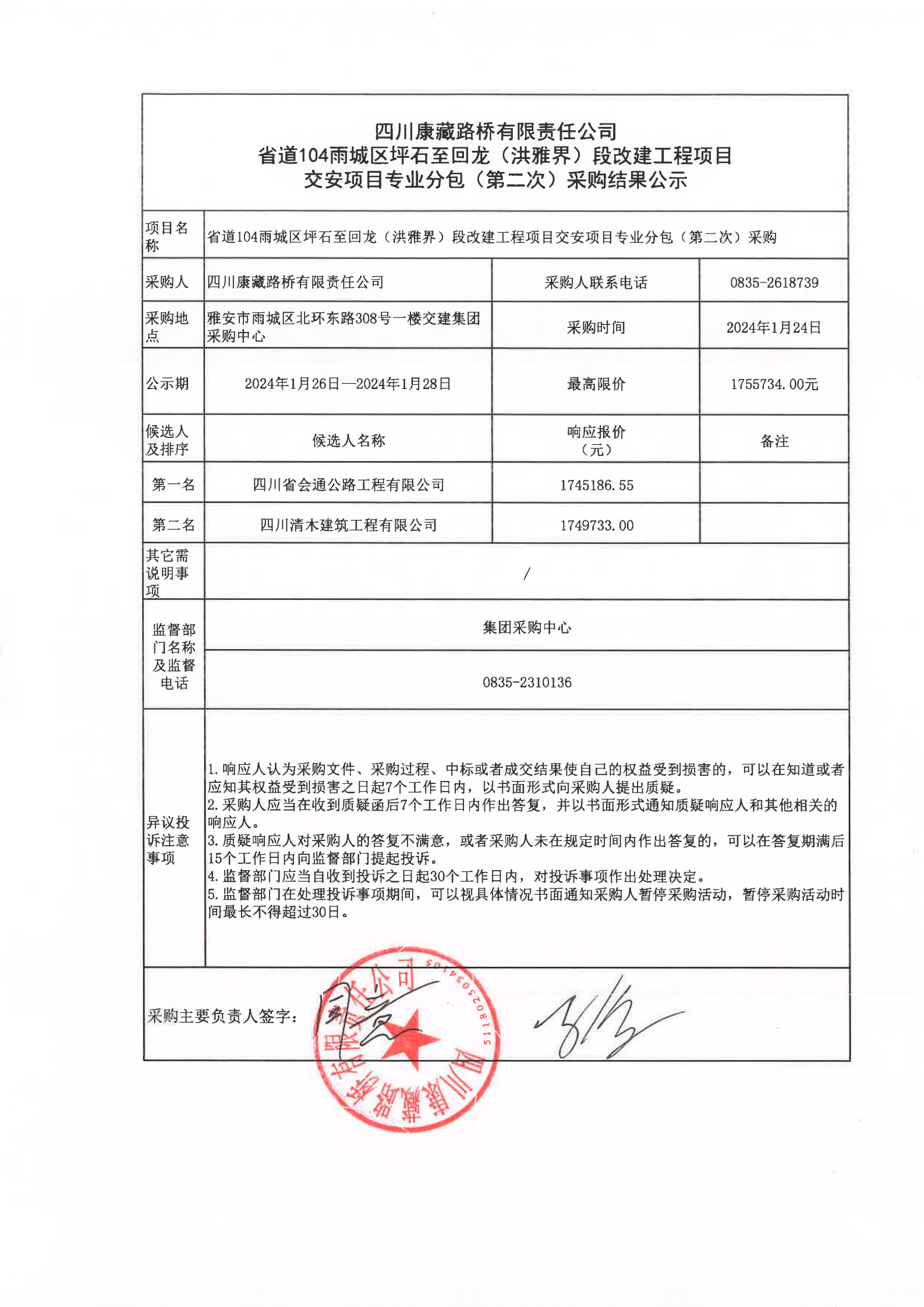 四川康藏路橋有限責(zé)任公司省道104雨城區(qū)坪石至回龍(洪雅界)段改建工程項目交安項目專業(yè)分包(第二次)采購結(jié)果公示