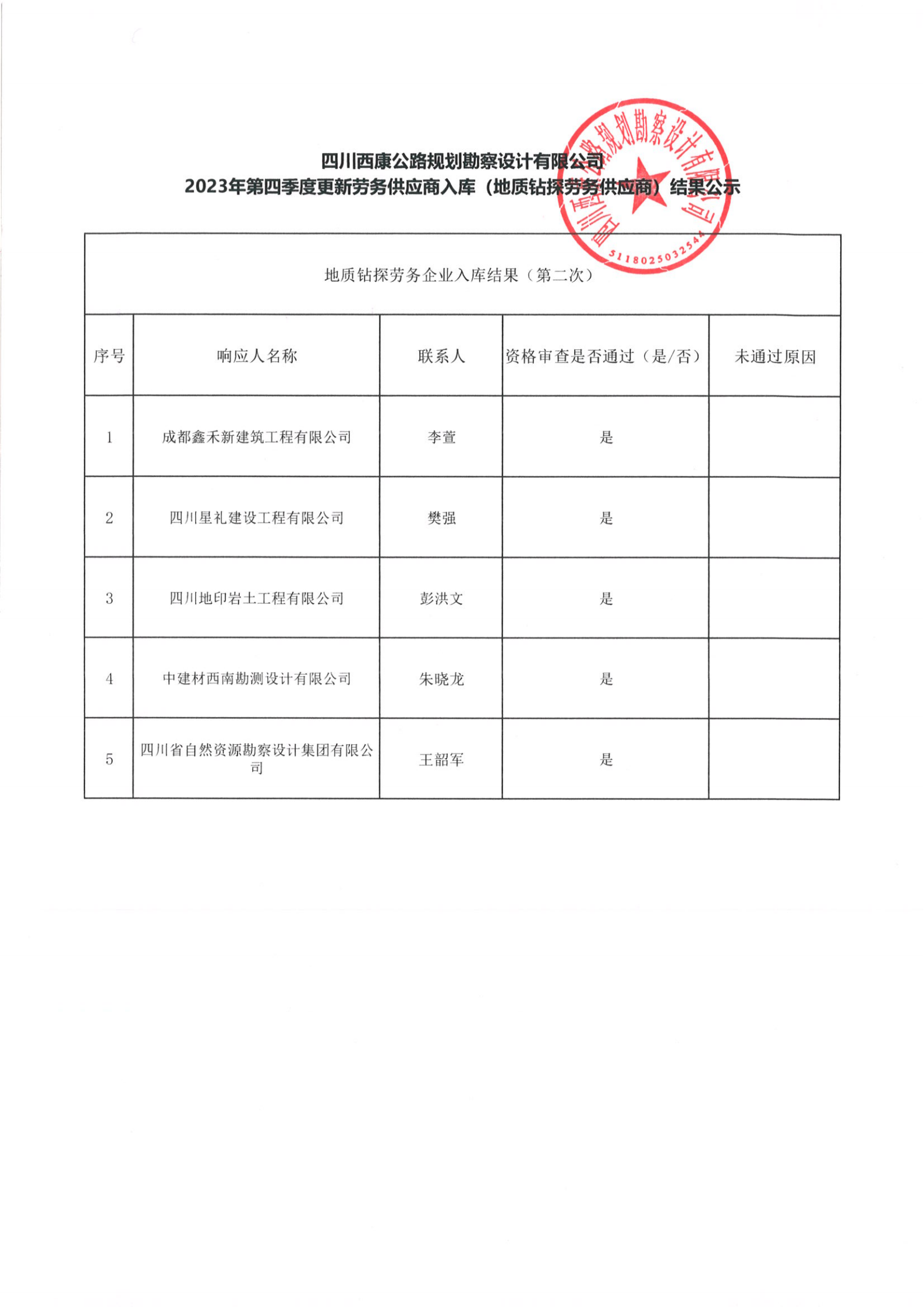 四川西康公路規(guī)劃勘察設(shè)計(jì)有限公司2023年第四季度更新勞務(wù)供應(yīng)入庫 (地質(zhì)鉆探勞務(wù)供應(yīng)商)結(jié)果公示