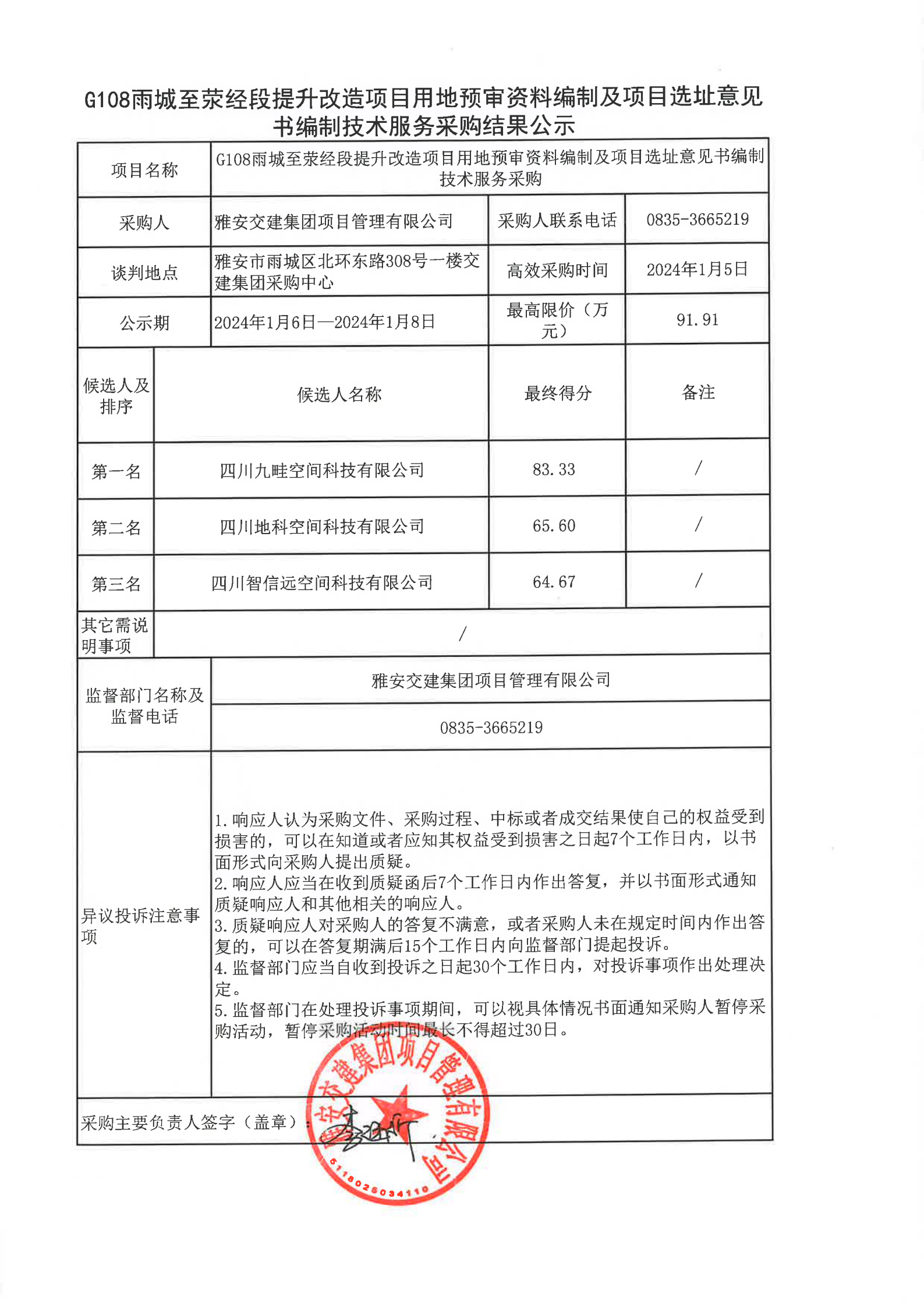 雅安交建集團(tuán)項(xiàng)目管理有限公司G108雨城至滎經(jīng)段提升改造項(xiàng)目用地預(yù)審資料編制及項(xiàng)目選址意見書編制技術(shù)服務(wù)采購(gòu)結(jié)果公示