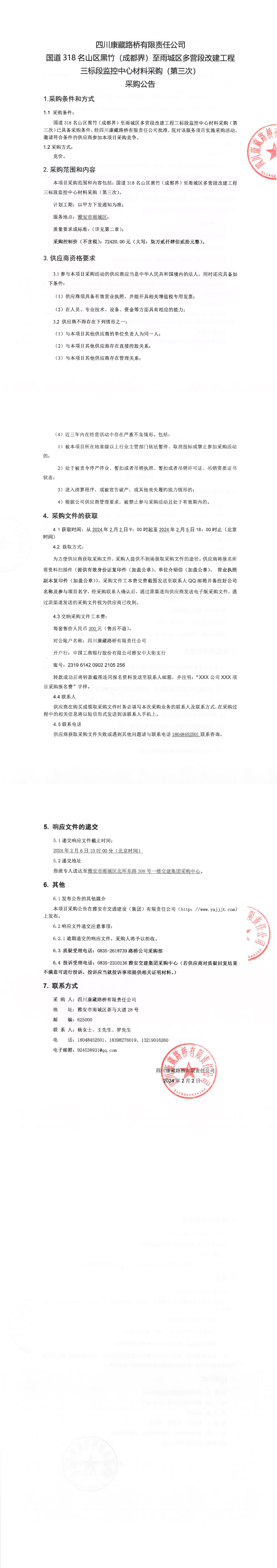四川康藏路橋有限責(zé)任公司國道318名山區(qū)黑竹(成都界)至雨城區(qū)多營段改建工程三標段監(jiān)控中心材料采購(第三次)采購公告