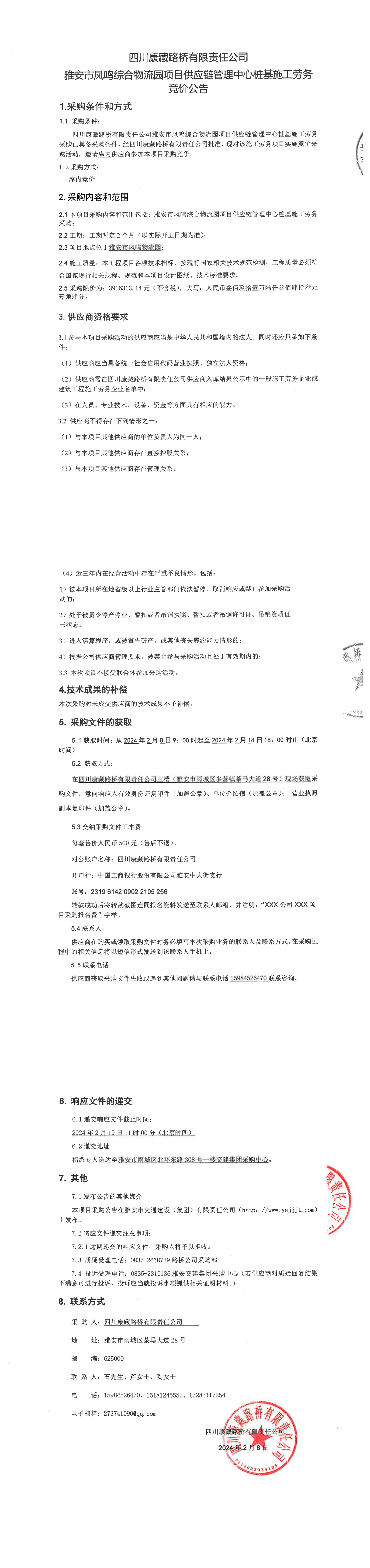 四川康藏路橋有限責(zé)任公司雅安市鳳鳴綜合物流園項目供應(yīng)鏈管理中心樁基施工勞務(wù)采購公告