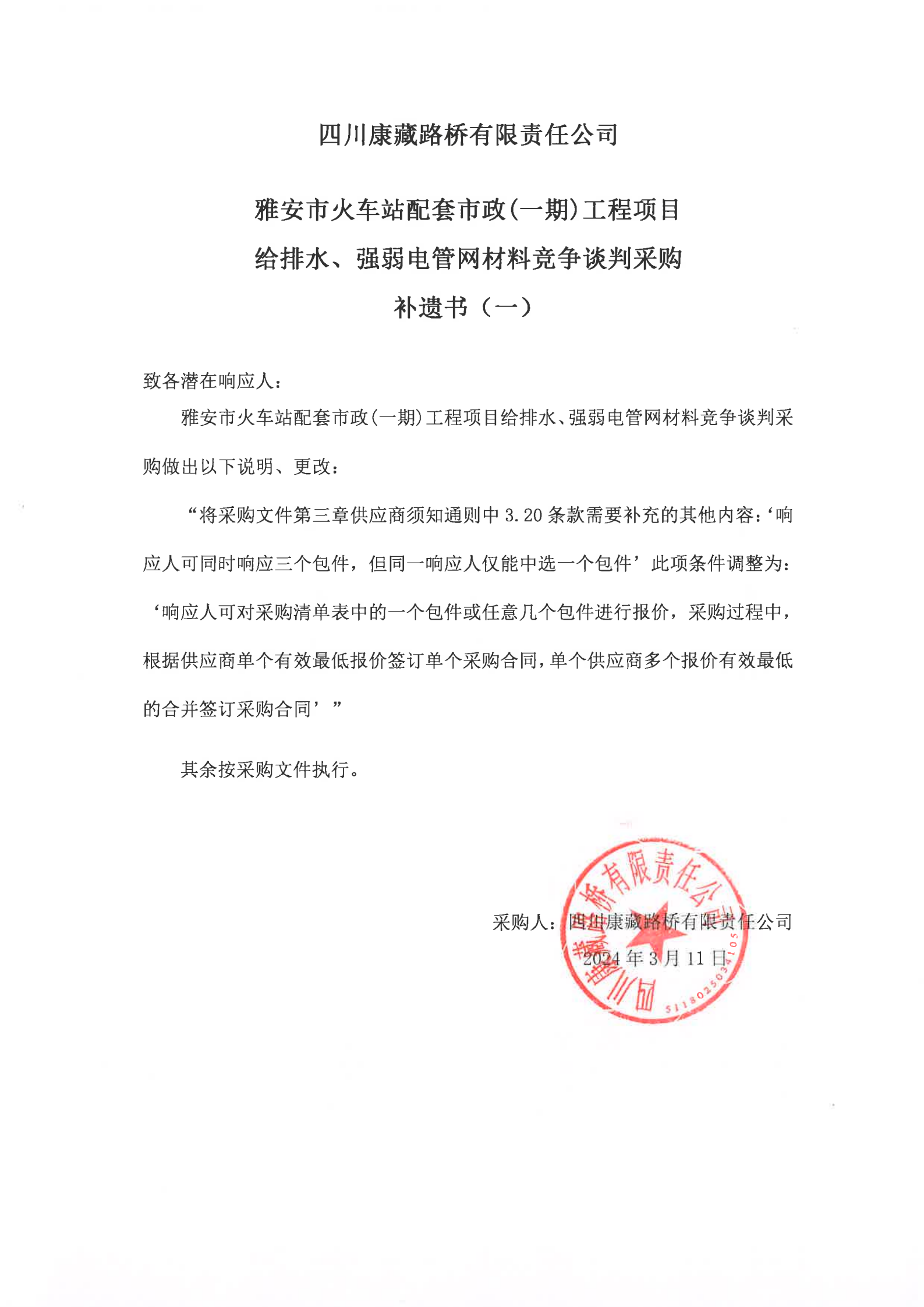 四川康藏路橋有限責(zé)任公司雅安市火車站配套市政(一期)工程項(xiàng)目給排水、強(qiáng)弱電管網(wǎng)材料競爭談判采購補(bǔ)遺書