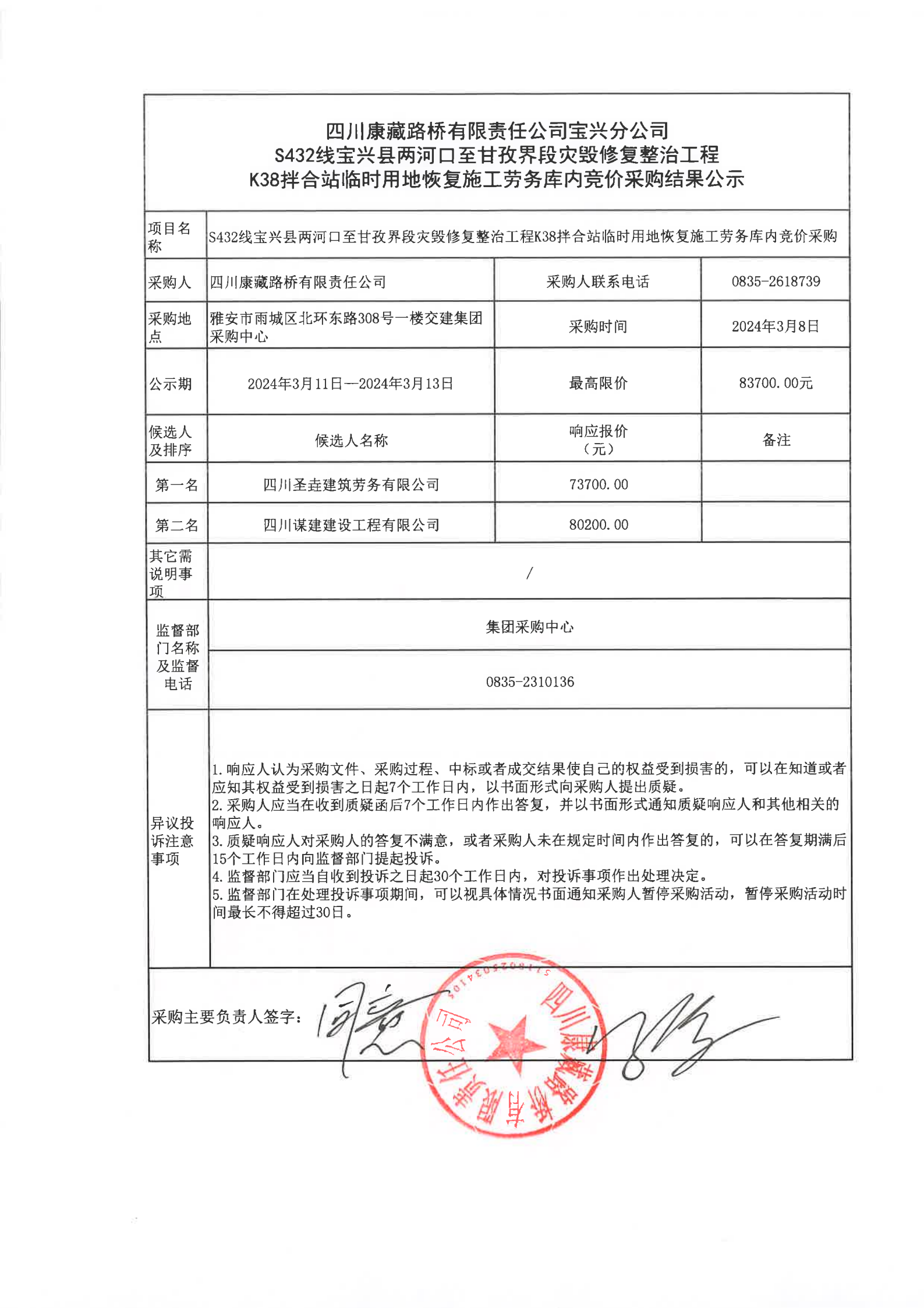 四川康藏路橋有限責(zé)任公司寶興分公司S432線寶興縣兩河口至甘孜界段災(zāi)毀修復(fù)整治工程K38拌合站臨時用地恢復(fù)施工勞務(wù)庫內(nèi)競價采購結(jié)果公示