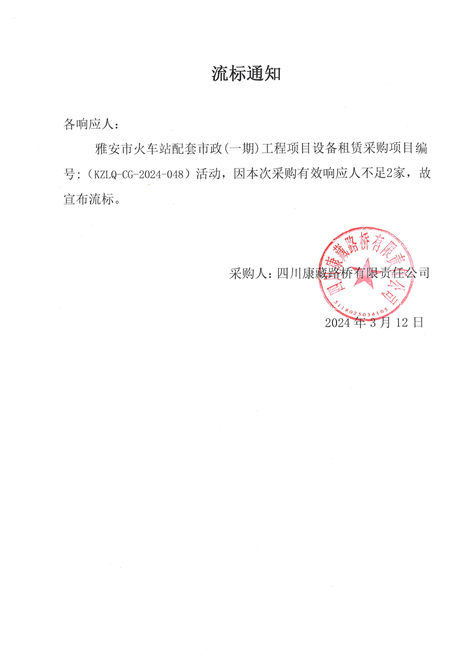 四川康藏路橋有限責任公司雅安市火車站配套市政(一期)工程項目設備租賃采購流標通知