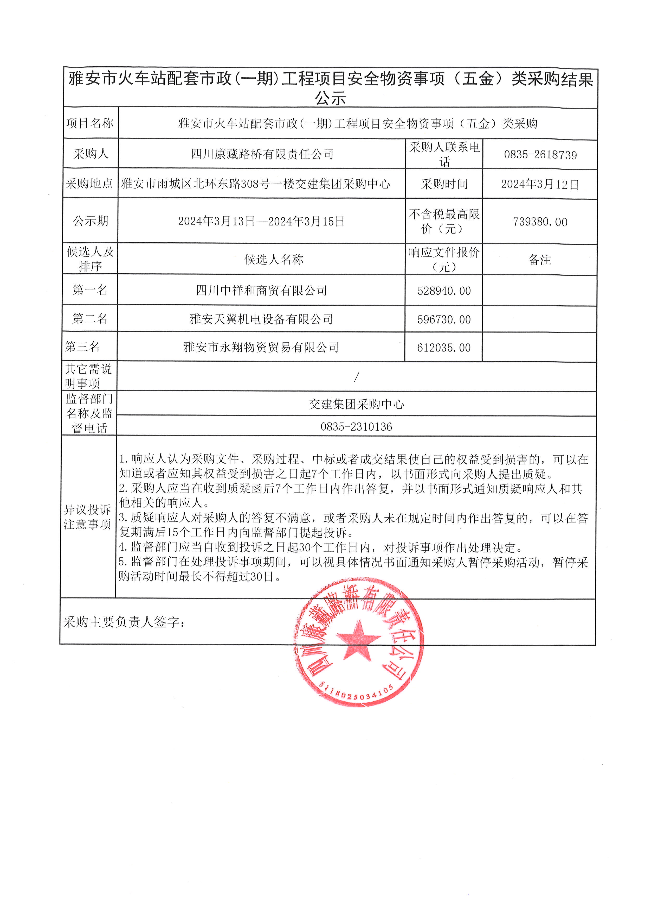 四川康藏路橋有限責(zé)任公司雅安市火車(chē)站配套市政(一期)工程項(xiàng)目安全物資(五金)采購(gòu)結(jié)果公示