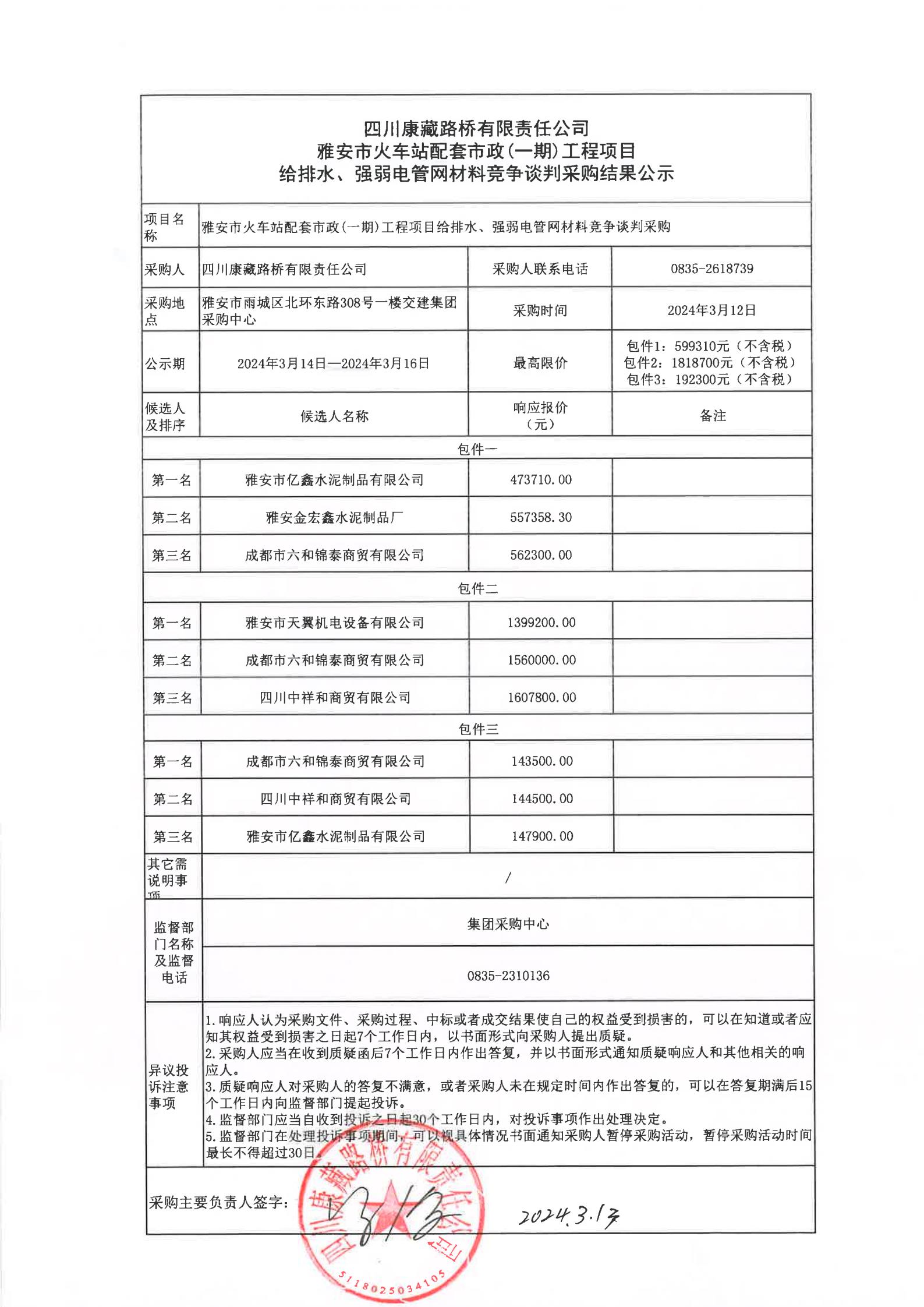 四川康藏路橋有限責任公司雅安市火車站配套市政(一期)工程項目給排水、強弱電管網材料采購結果公示