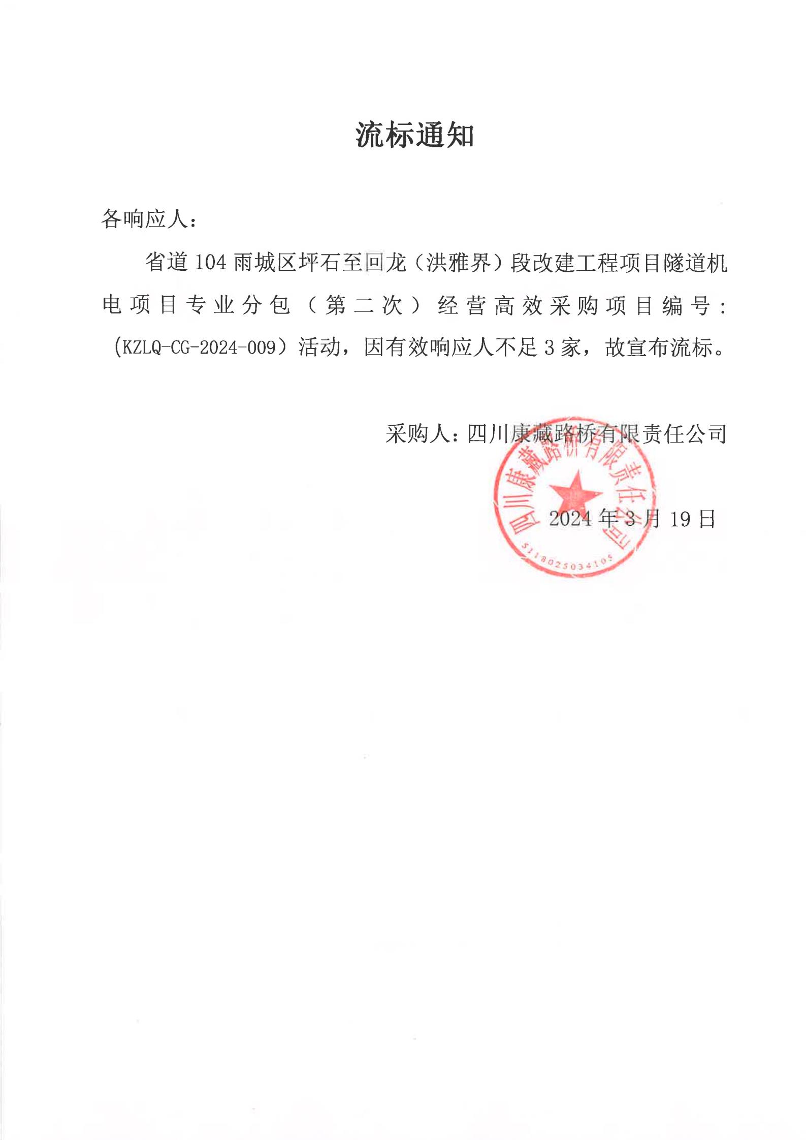 四川康藏路橋有限責(zé)任公司省道104雨城區(qū)坪石至回龍(洪雅界)段改建工程項目隧道機電項目專業(yè)分包經(jīng)營高效采購(第二次)流標(biāo)通知