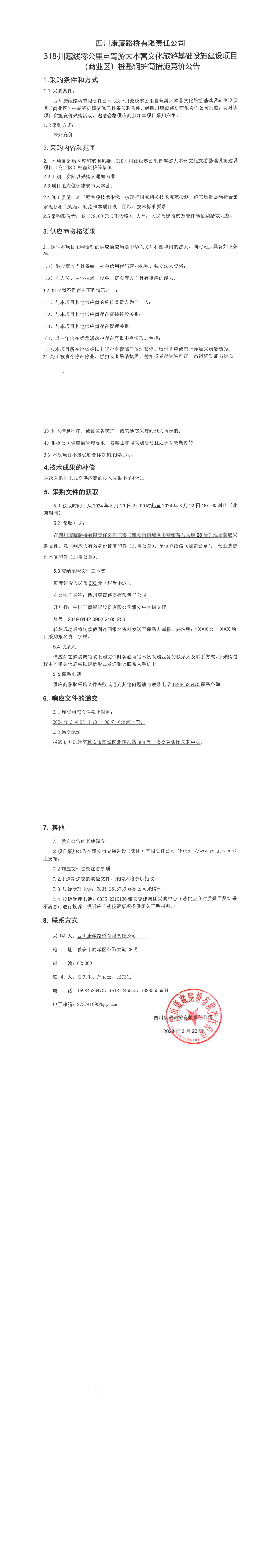 四川康藏路橋有限責(zé)任公司318·川藏公路零公里自駕游大本營文化旅游基礎(chǔ)設(shè)施建設(shè)項(xiàng)目(商業(yè)區(qū))樁基鋼護(hù)筒措施競價(jià)公告