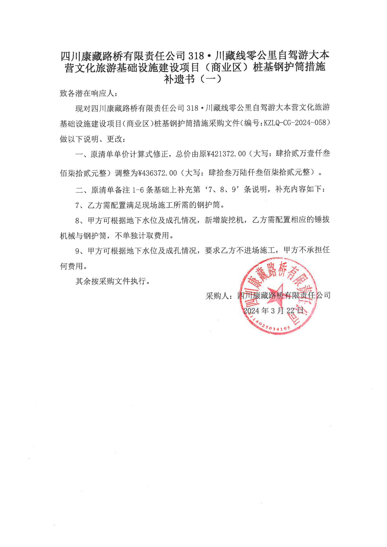 四川康藏路橋有限責(zé)任公司318·川藏公路零公里自駕游大本營(yíng)文化旅游基礎(chǔ)設(shè)施建設(shè)項(xiàng)目(商業(yè)區(qū))樁基鋼護(hù)筒措施補(bǔ)遺書(一)