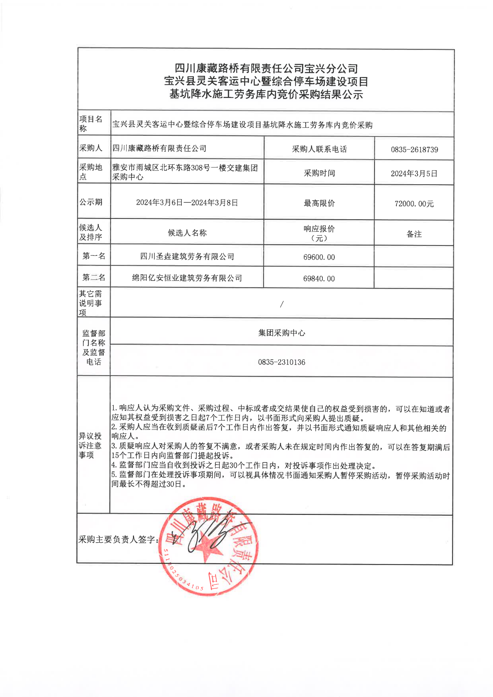 四川康藏路橋有限責(zé)任公司寶興分公司寶興縣靈關(guān)客運站中心暨綜合停車場建設(shè)項目基坑降水施工勞務(wù)庫內(nèi)競價采購結(jié)果公示