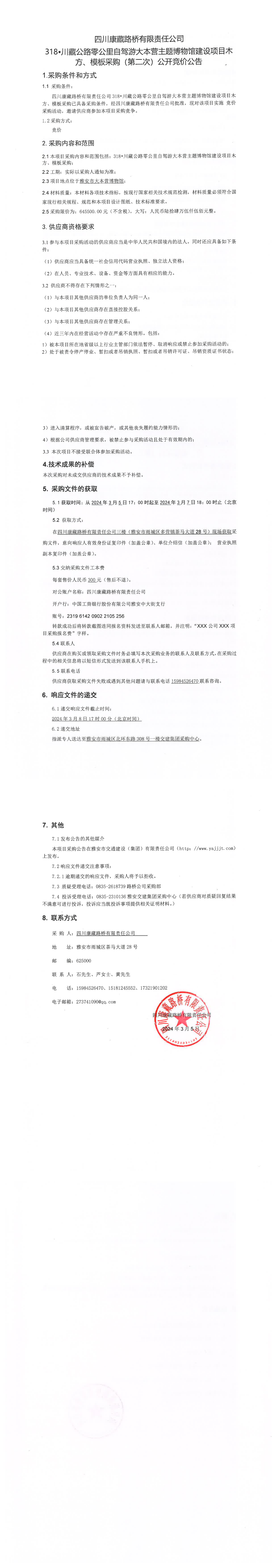 四川康藏路橋有限責(zé)任公司318·川藏公路零公里自駕游大本營(yíng)主題博物館建設(shè)項(xiàng)目木方、模板采購(gòu)(第二次)公開競(jìng)價(jià)公告