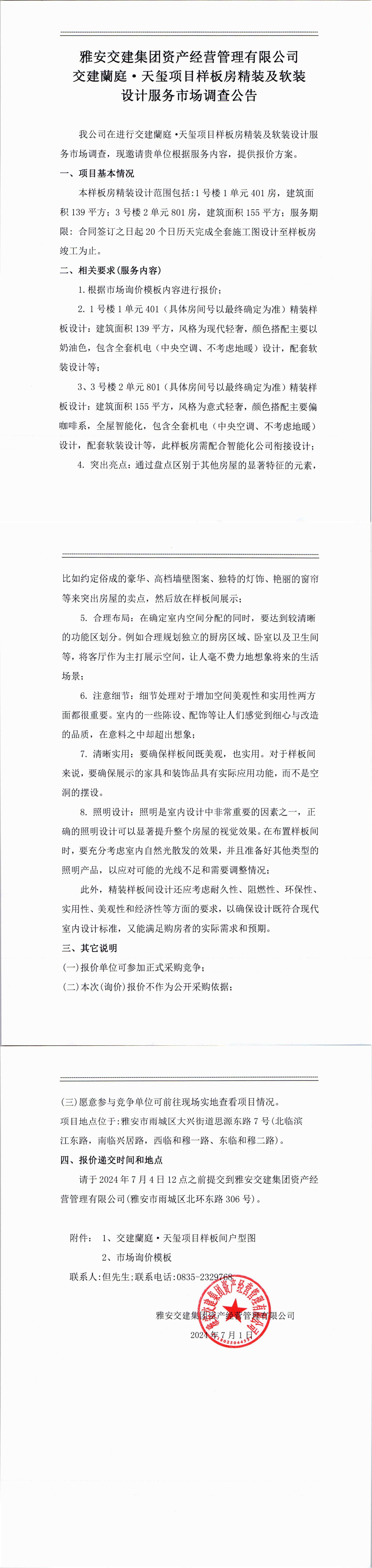 雅安交建集團資產經(jīng)營管理有限公司交建蘭庭·天璽項目樣板房精裝及軟裝設計服務市場調查公告