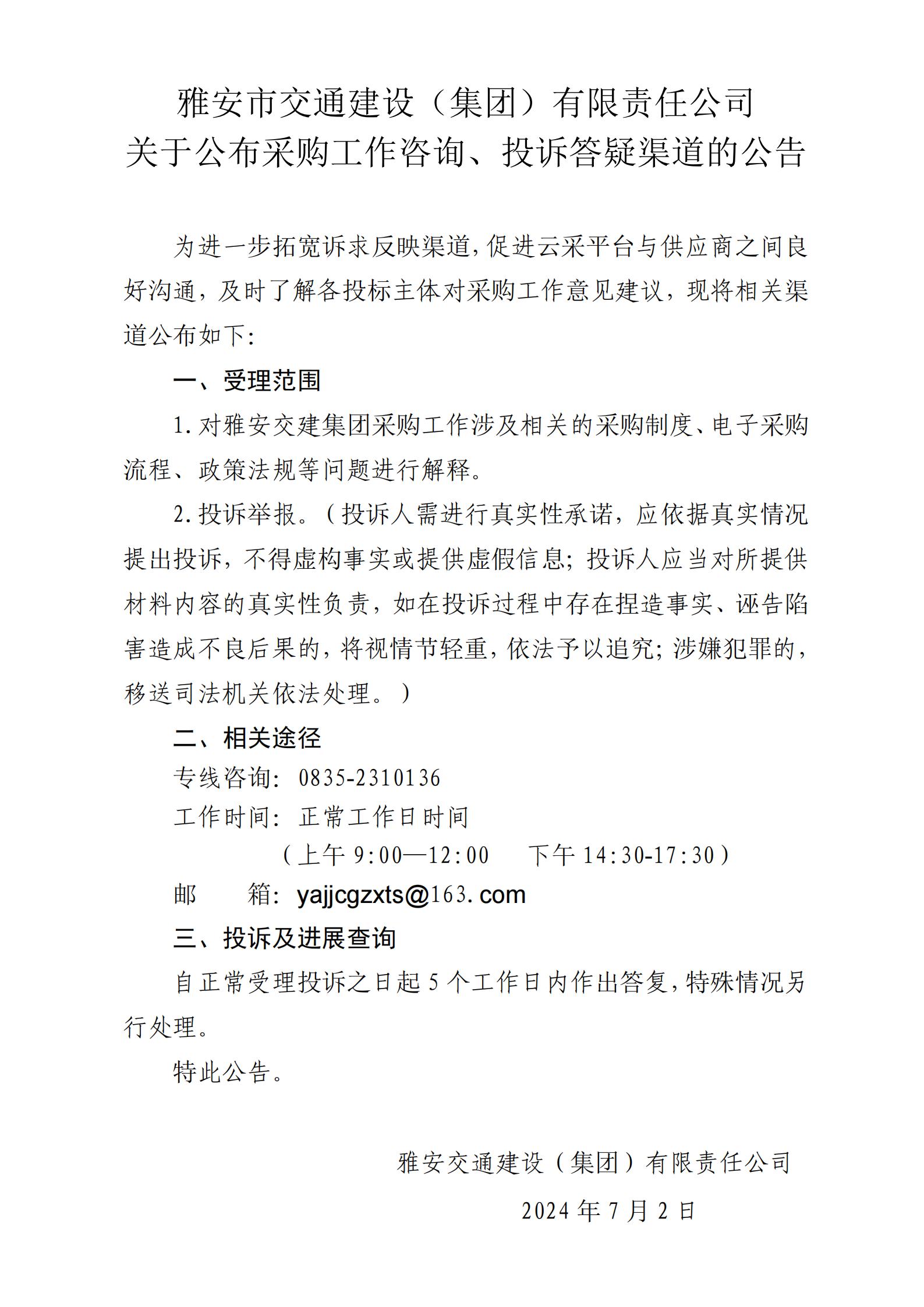 雅安市交通建設(shè)(集團(tuán))有限責(zé)任公司關(guān)于公布采購工作咨詢、投訴答疑渠道的公告