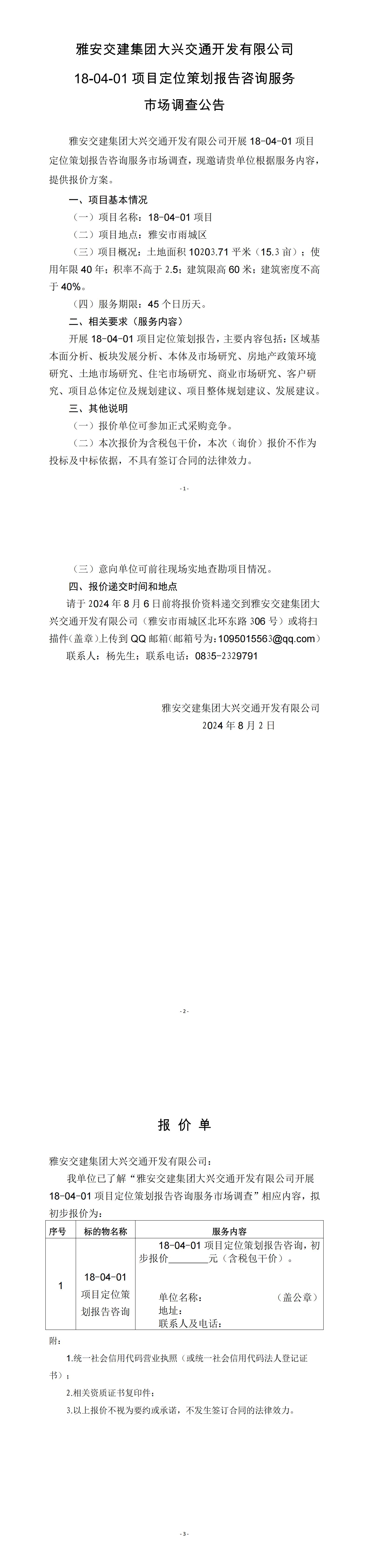 雅安交建集團(tuán)大興交通開發(fā)有限公司18-04-01項(xiàng)目定位策劃報(bào)告咨詢服務(wù)市場(chǎng)調(diào)查公告