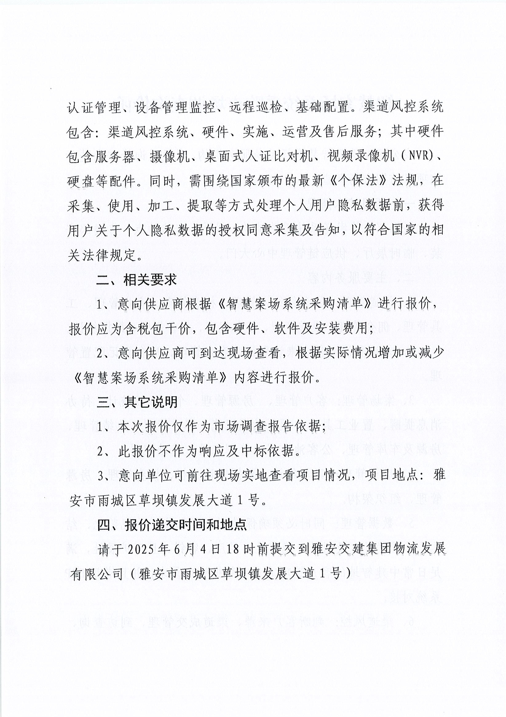 雅安交建集團(tuán)物流發(fā)展有限公司智慧案場(chǎng)系統(tǒng)采購(gòu)市場(chǎng)調(diào)查詢(xún)價(jià)函
