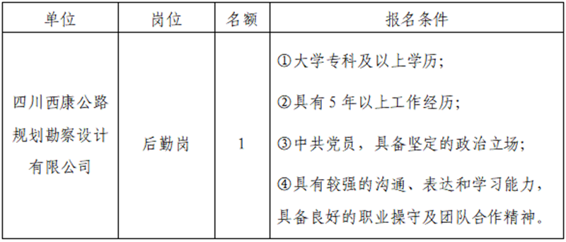 根據(jù)發(fā)展需要,決定面向社會公開招聘雅安市交通建設(shè)(集團(tuán))有限責(zé)任公司(以下簡稱“雅安交建集團(tuán)”)所屬子公司綜合辦公室后勤崗1名,現(xiàn)將有關(guān)事項公告如下: