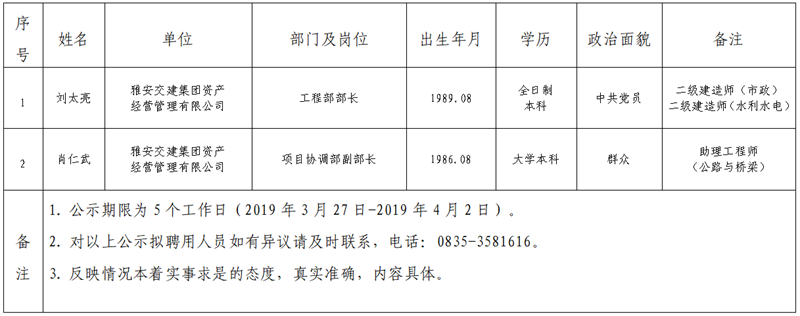 雅安交建集團(tuán)子公司擬聘用人員公示(資產(chǎn)經(jīng)營管理公司)