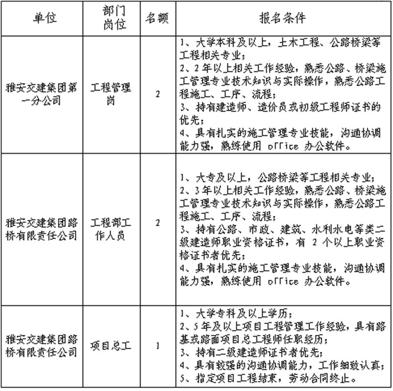 根據(jù)發(fā)展需要,決定面向社會(huì)公開(kāi)招聘雅安市交通建設(shè)(集團(tuán))有限責(zé)任公司(以下簡(jiǎn)稱“雅安交建集團(tuán)”)所屬分子公司工作人員5名,現(xiàn)將有關(guān)事項(xiàng)公告如下: