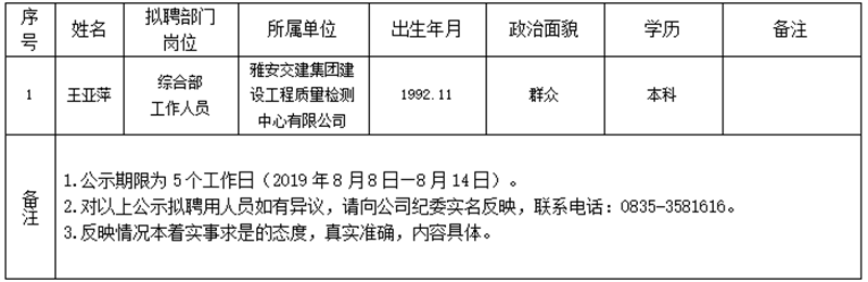 雅安交建集團(tuán)子公司擬聘用人員公示(工程質(zhì)量檢測中心)