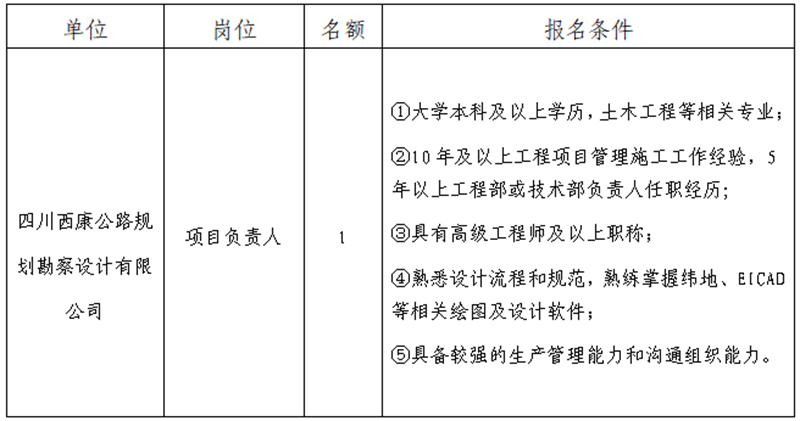 根據(jù)發(fā)展需要,決定面向社會公開招聘雅安市交通建設(集團)有限責任公司(以下簡稱“雅安交建集團”)所屬子公司項目負責人1名,現(xiàn)將有關事項公告如下: