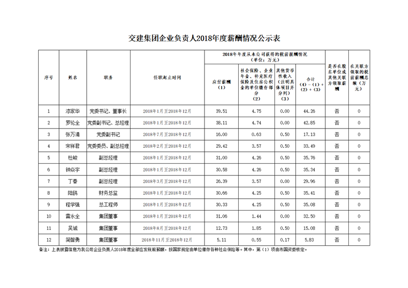 交建集團企業(yè)負責人2018年度薪酬情況公示表