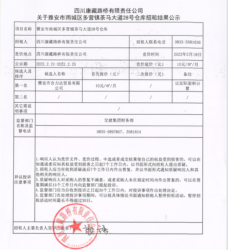 四川康藏路橋有限責(zé)任公司關(guān)于雅安市雨城區(qū)多營鎮(zhèn)茶馬大道28號(hào)倉庫招租結(jié)果的公示
