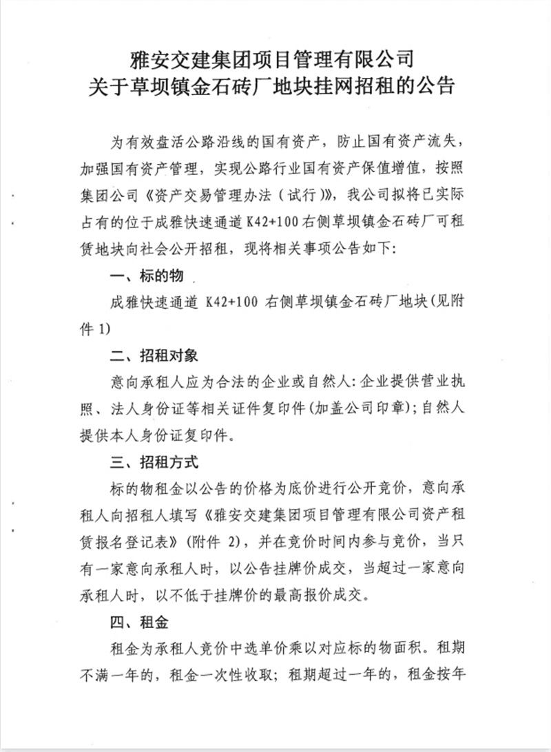 關(guān)于金石磚廠地塊公開招租的公告